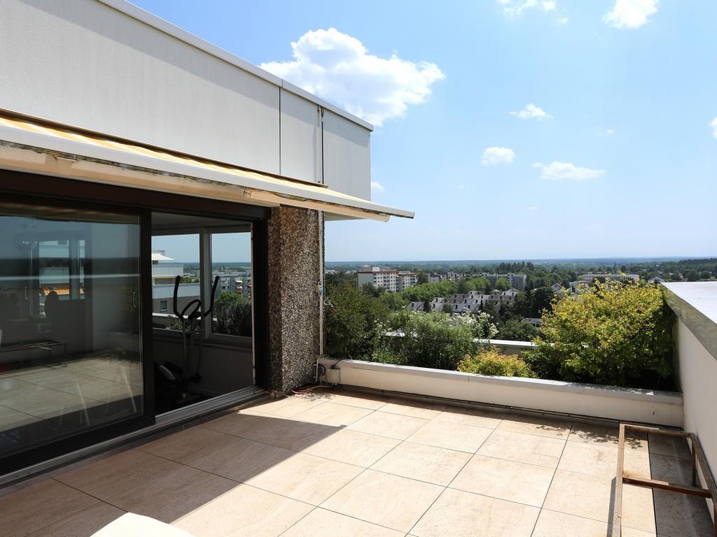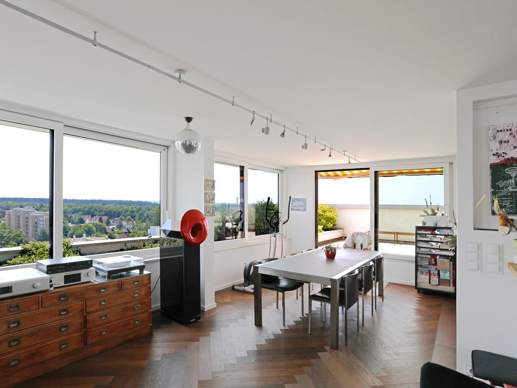 Die hier angebotene, lichterfüllte und gut geschnittene 4-Zimmer-Penthousewohnung befindet sich im zwölften und somit obersten Stockwerk und ist über das Treppenhaus oder über einen der beiden Aufzüge zu erreichen. Besonders hervorzuheben ist der Rundumblick in alle Himmelsrichtungen – mit Blick auf die Skyline von München sowie bei Fön mit wunderschönem Bergblick vom Wendelstein bis zur Zugspitze!