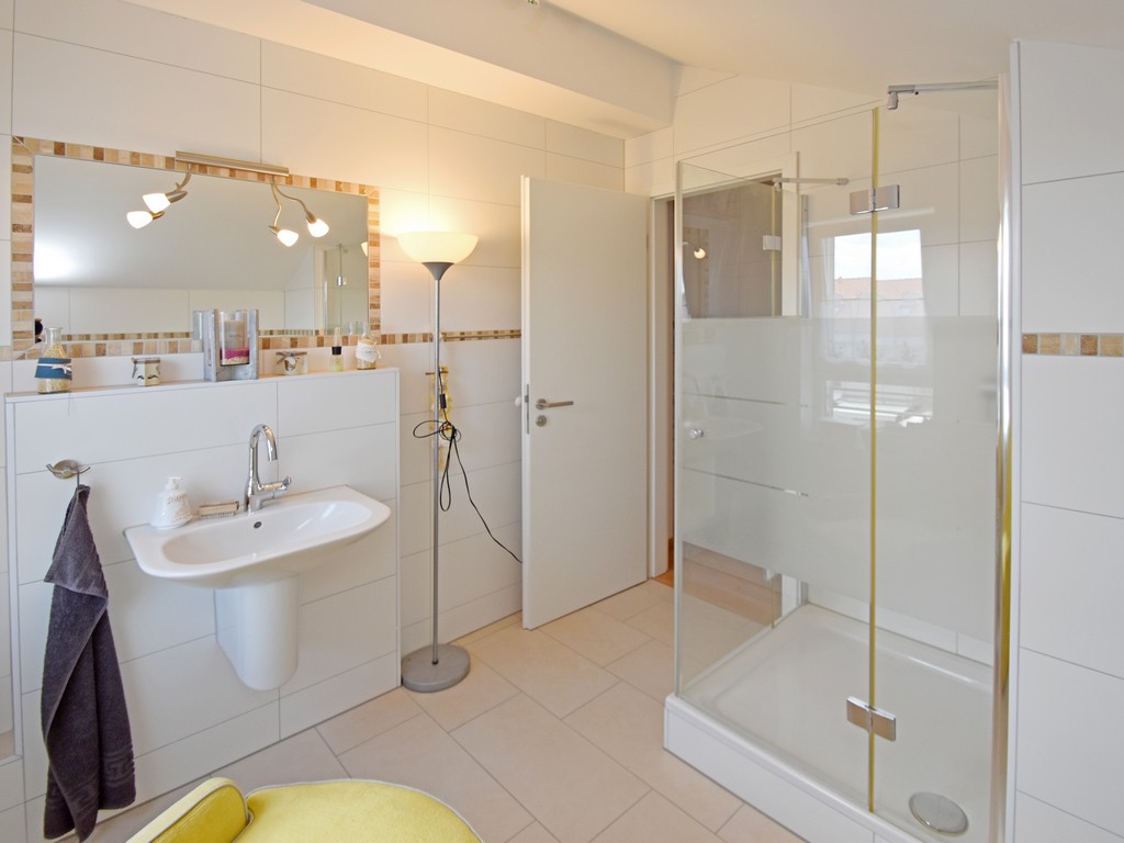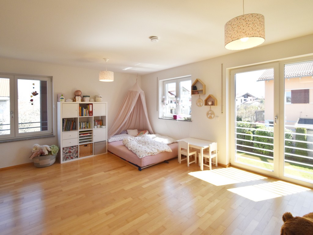 Über das Treppenhaus erreicht man das Obergeschoss. Vom Flur hat man Zugang zu dem ca. 12 m² großen Schlafzimmer, dem ca. 23 m² großen Kinderzimmer und zu einem Tageslichtbadezimmer mit Badewanne und separater Dusche.