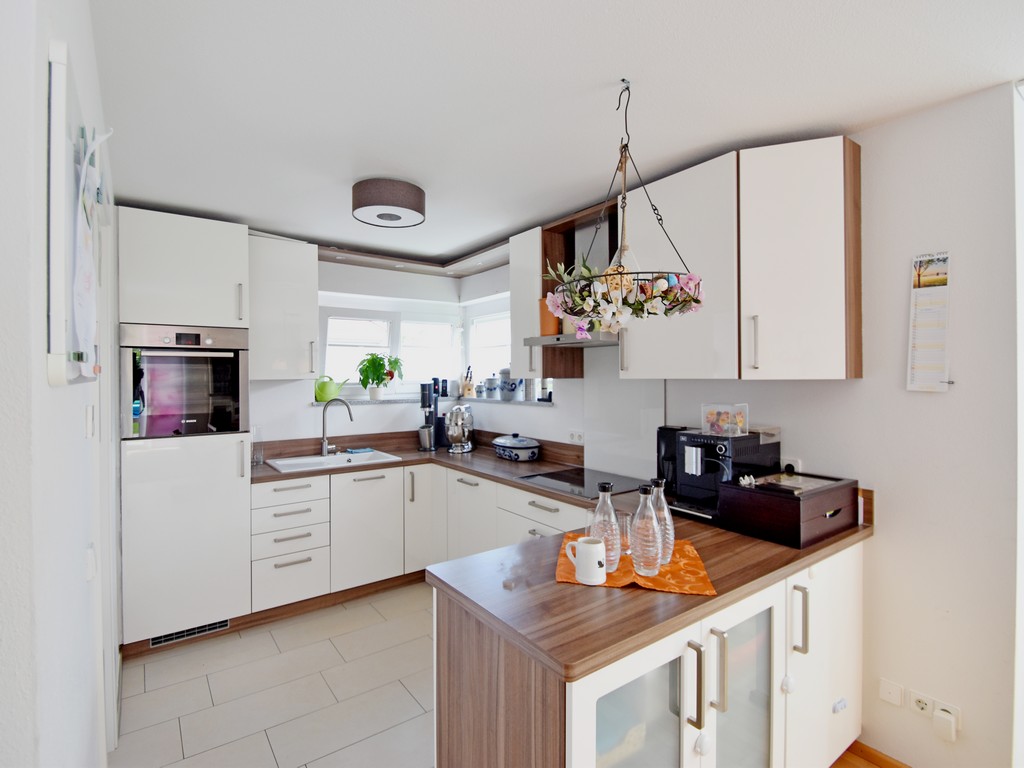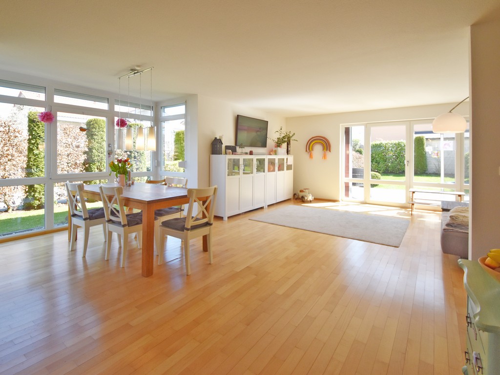 Der Essbereich liegt in einem hellen Erker mit bodentiefen Fenstern. Durch das Wohnzimmer gelangt man auf die Terrasse und in den Garten. Die Küche ist sehr modern und beinhaltet alle üblichen elektrischen Geräte.