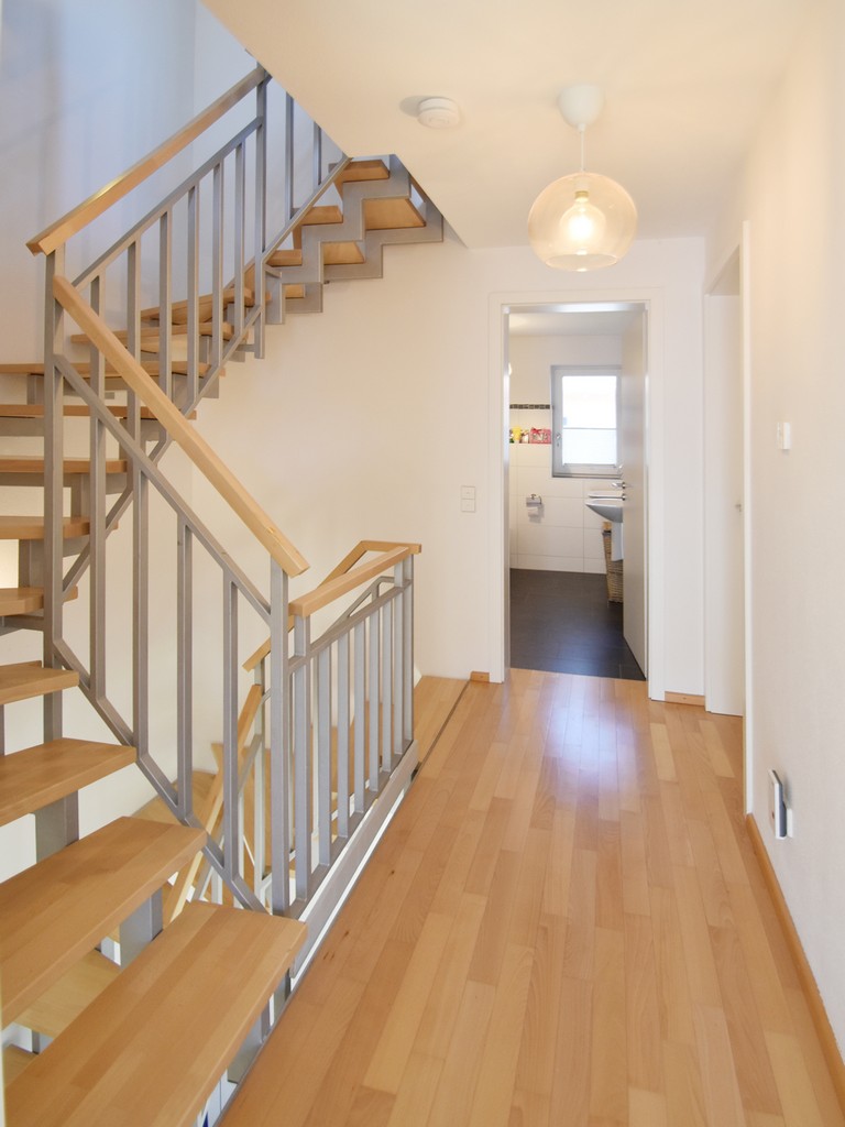 Der Boden wurde in allen Räumen mit hochwertigem, lackiertem Parkett belegt. Der Flur, das WC, die Küche sowie das Bad im Dachgeschoss wurden mit hellem, das Bad im OG mit dunklem Feinsteinzeug belegt.