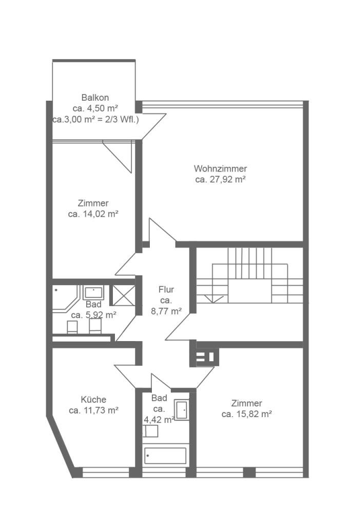 Die Wohnung besticht durch einen geradlinigen und durchdachten Grundriss und ist über das geräumige Treppenhaus zu erreichen.