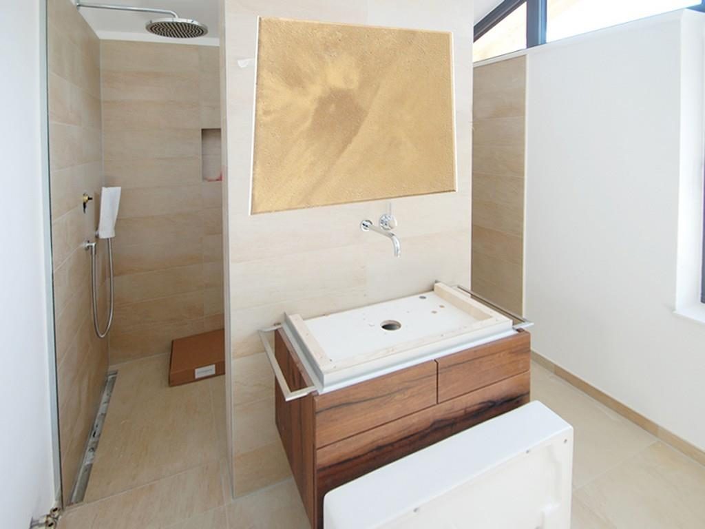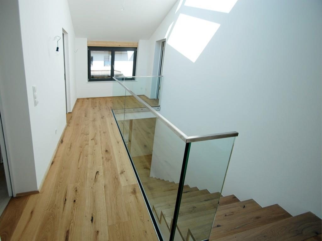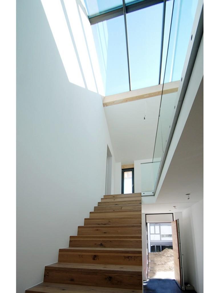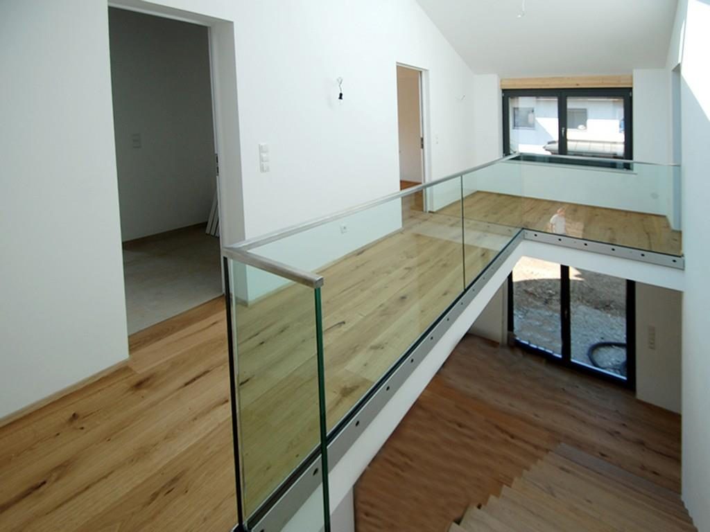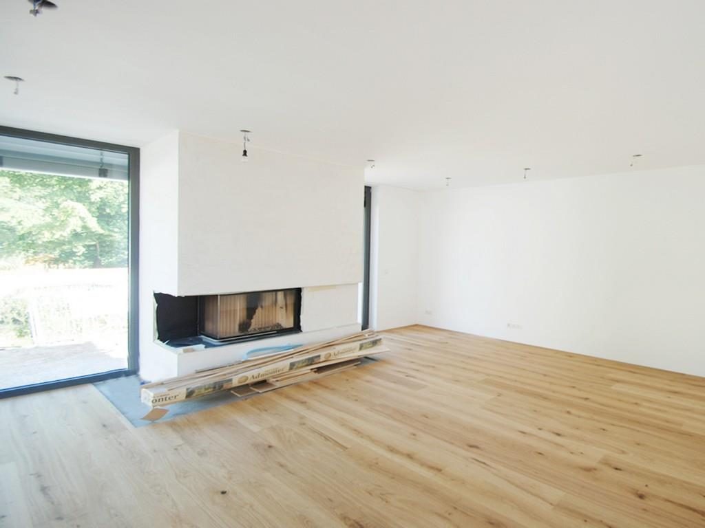 Material Innenausbau: Vollholzparkett, Feinstein, Holz-Aluminium-Fenster, Stahlbeton, Edelstahl, Glattputz