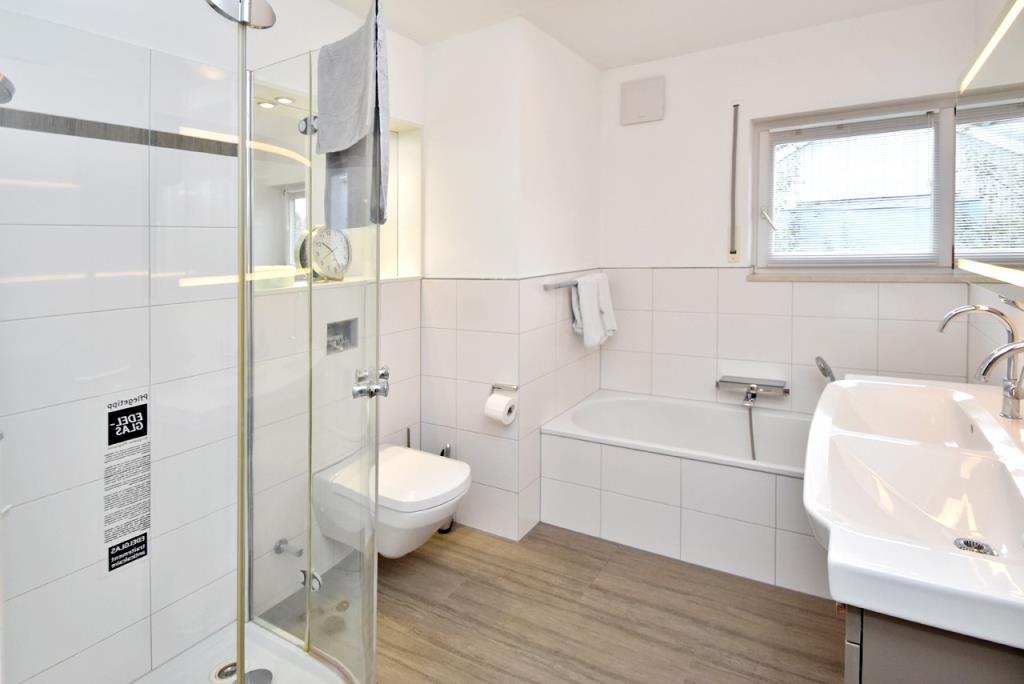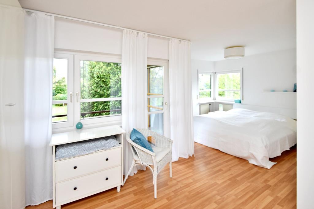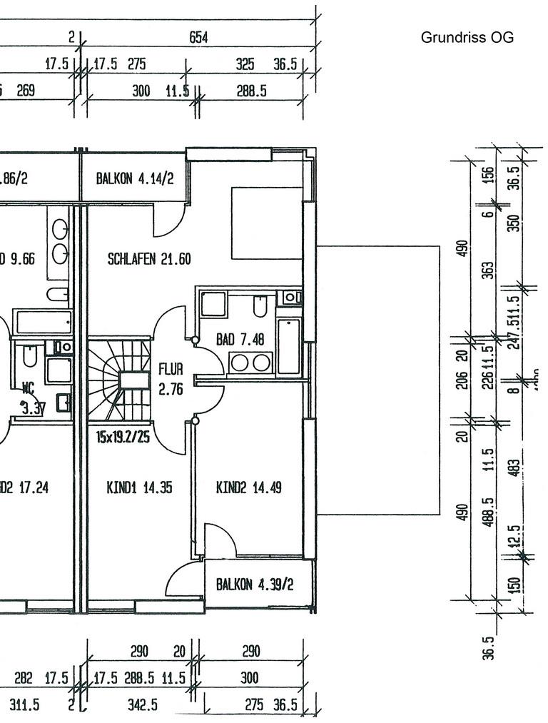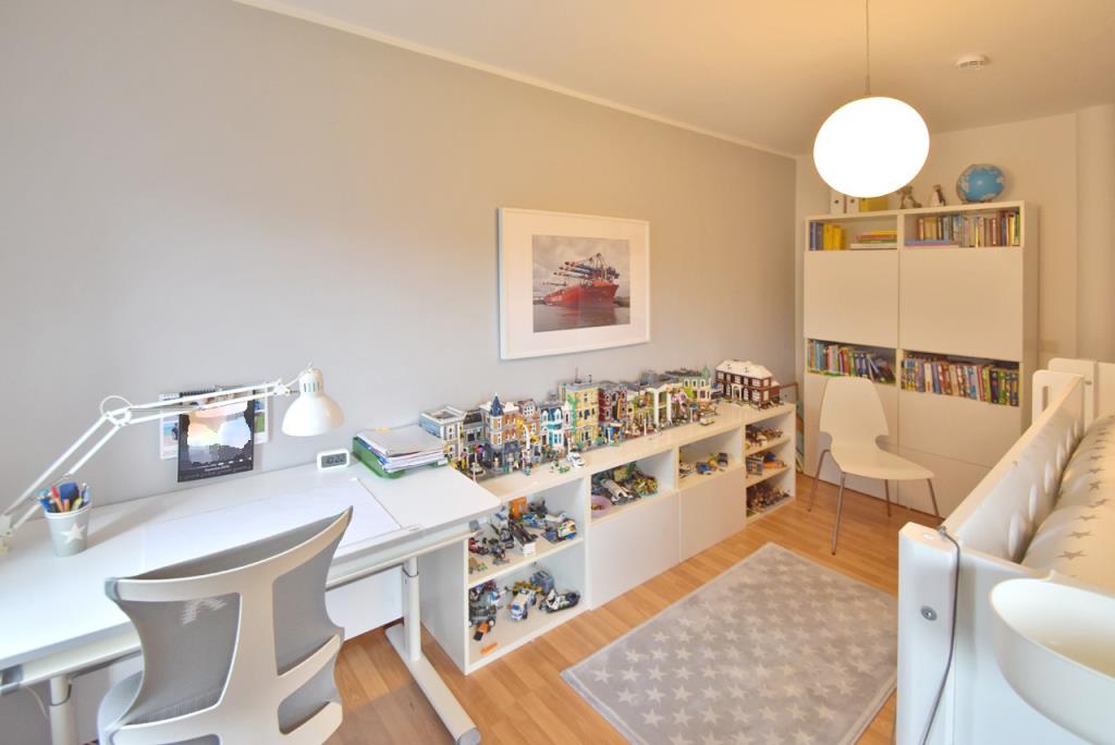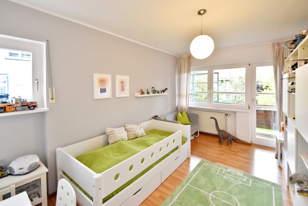 In dieser Etage befinden sich ein großes Schlafzimmer mit ca. 22 m², zwei Kinderzimmer mit je ca. 14 m² sowie ein geräumiges Badezimmer mit Doppelwaschbecken, Wanne und Dusche. Zu beiden Seiten des Hauses schließen sich Balkone an, welche von den Schlafräumen aus zugänglich sind.