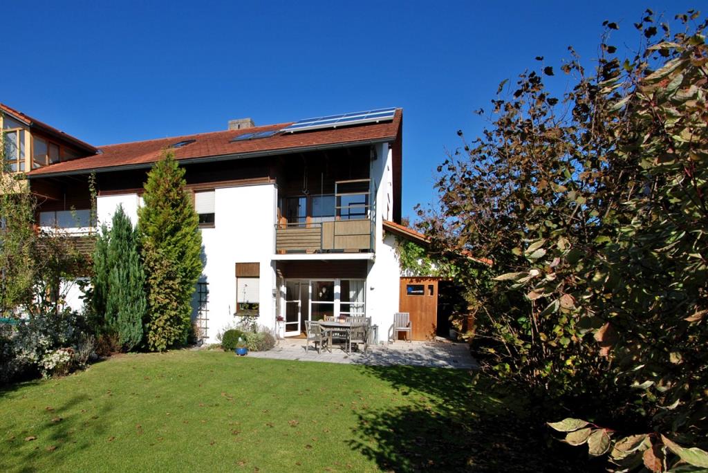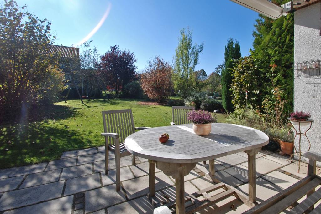 Auf der Süd-Westseite des Hauses liegt der große Garten mit einer gemütlichen Terrasse, welche auch mit einer Markise zur Verschattung ausgestattet ist. Durch die ideale Ausrichtung können Sie auch bis Abends die Sonne genießen.