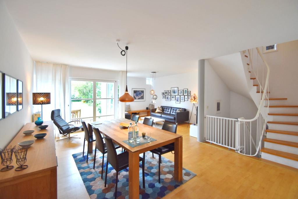 Durch einen großzügigen Dielenbereich mit eingebautem Garderobenschrank und anschließendem Gäste-WC gelangt man sowohl in die Küche wie auch in den hellen und offenen Wohn- und Essbereich.