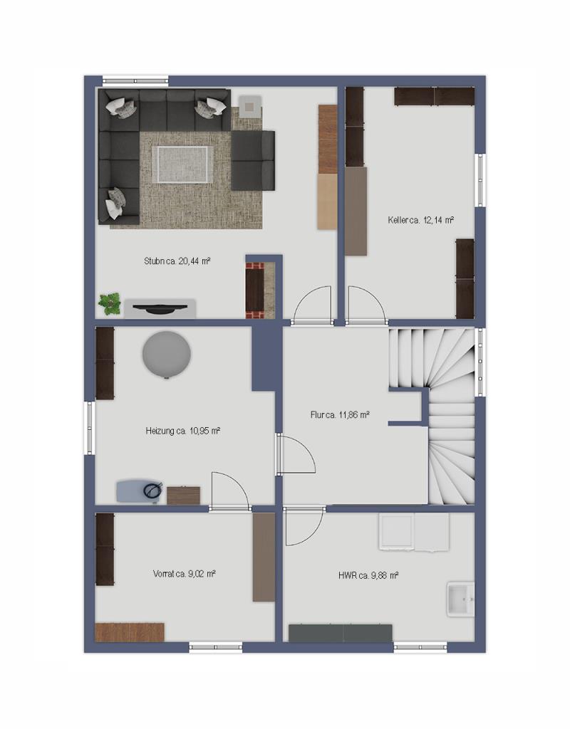 UG: Waschküche, Vorratsraum, Heizraum, Keller und Stubn