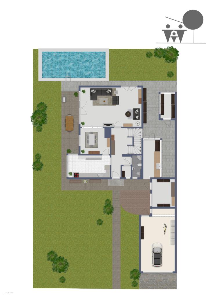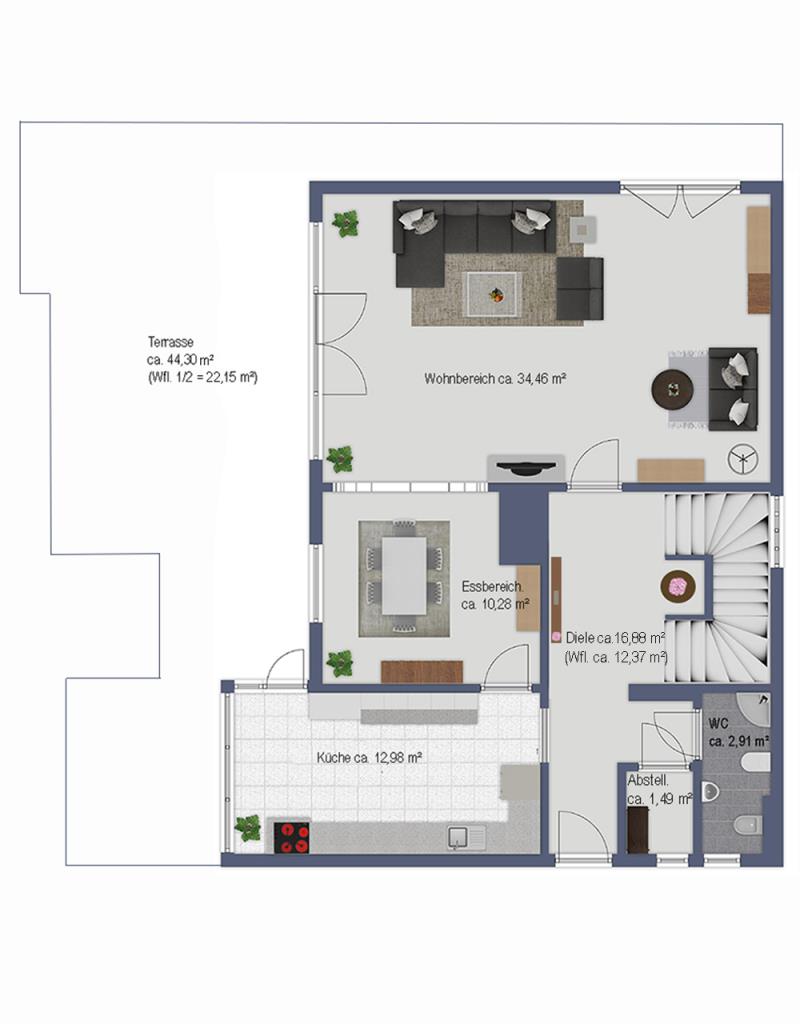 EG: Wohnbereich, Essbereich, Küche, Gäste-WC, Diele, Abstellkammer