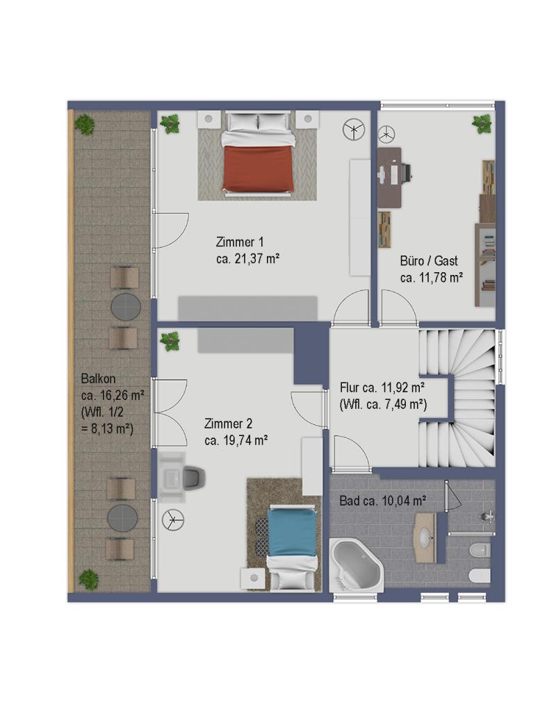OG: Bad, 3 Zimmer, Flur