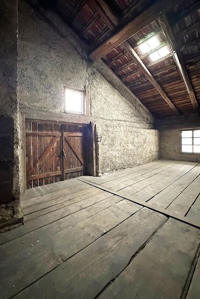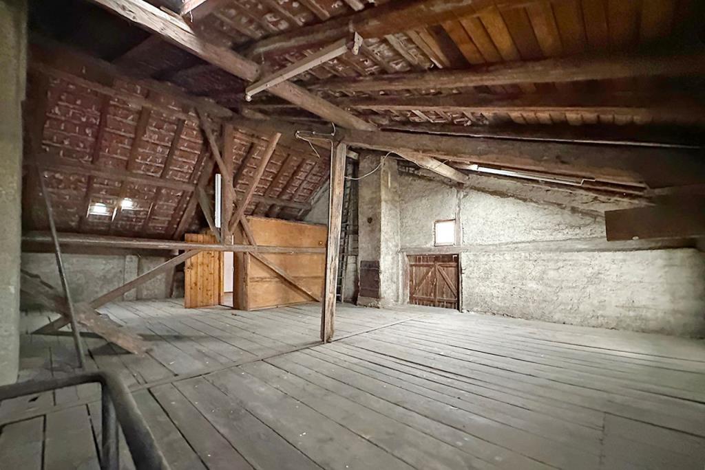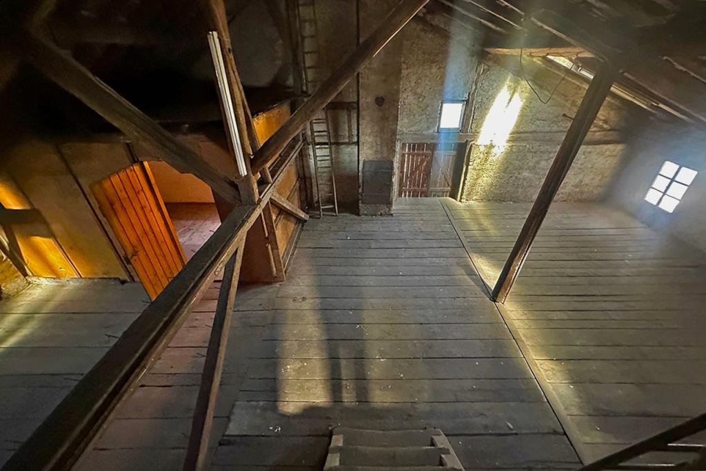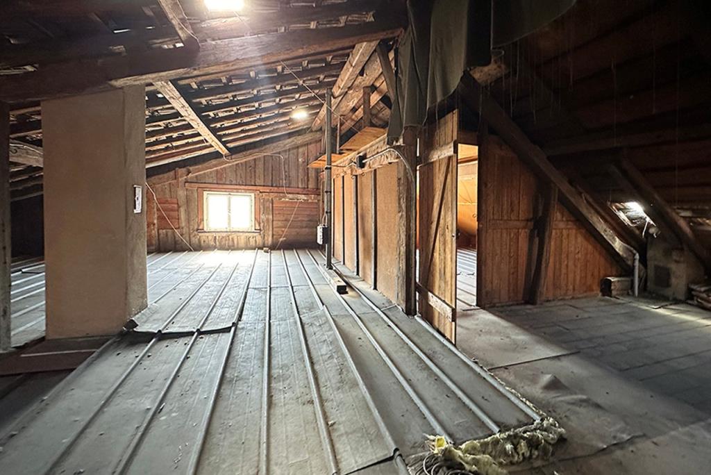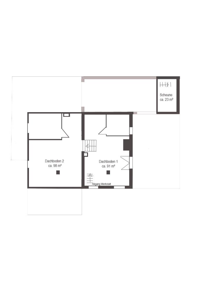 Der Dachboden reicht vom niedrigeren Dachgeschoss über dem ehemaligen Wohnteil bis in den Dachraum oberhalb der Werkstatt. Bei einem möglichen Ausbau des gesamten Dachraums zu Wohnraum oder aber einem Masterschlafzimmer mit über 3 Meter Raumhöhe lässt auch hier die Vielfalt keine Wünsche offen.