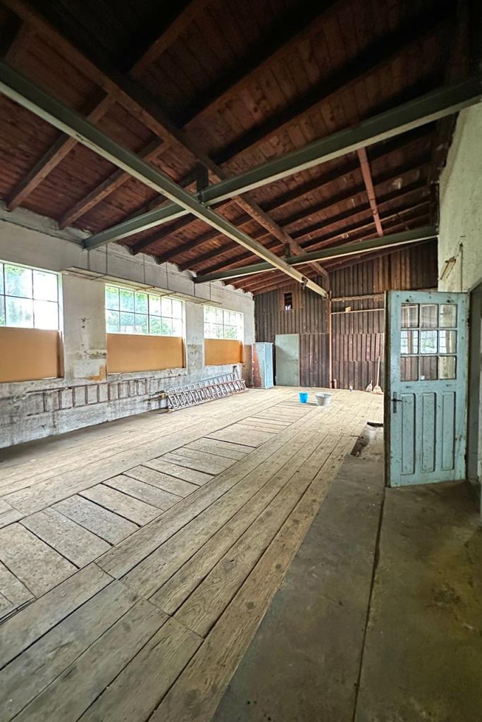 Betreten können Sie die Halle von der Zufahrt im Nord-Westen oder aber über den Hof im südlichen Teil. Sie wurde als Unterstellhalle für Lastenwagen genutzt und verfügt über einen Dielenboden und eine innenliegende Fahrspur. Über die Halle gelangen Sie in eine angrenzende Scheune und eine Garage. Zudem erreichen Sie von hier auch die Werkstatt.