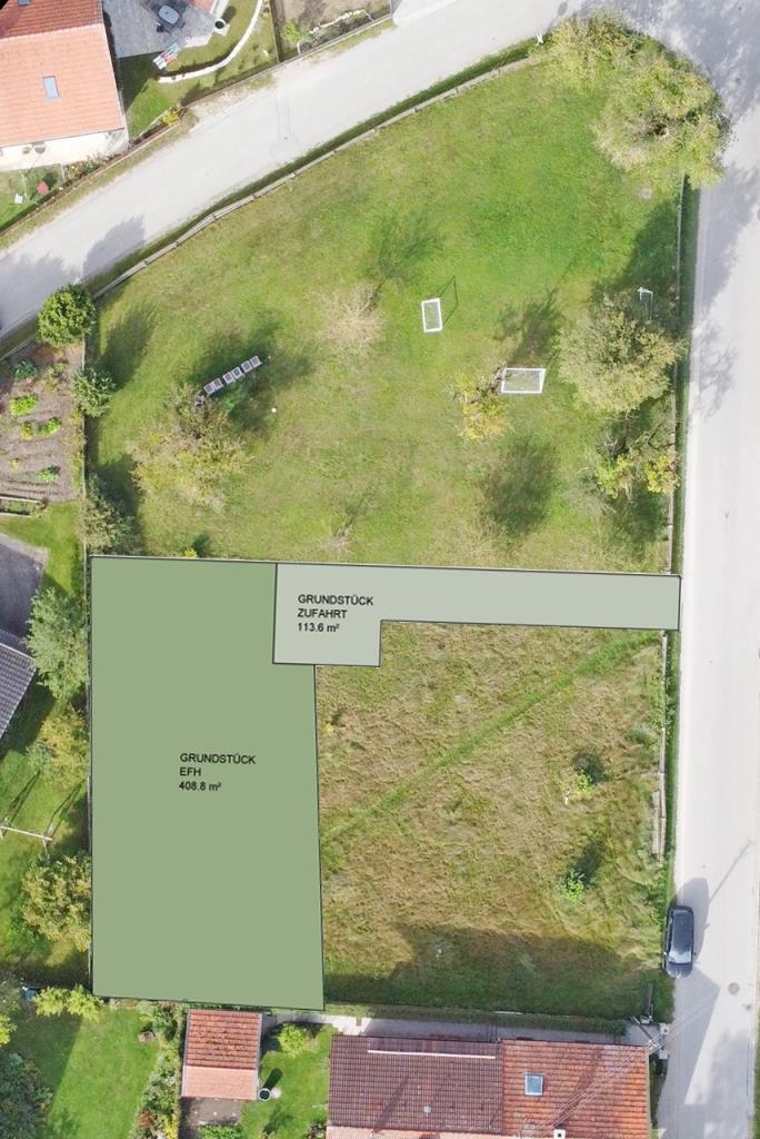 Das gesamte Grundstück ist real geteilt und die Grundstücksgröße für das Einfamilienhaus beträgt ca. 408,8 m².