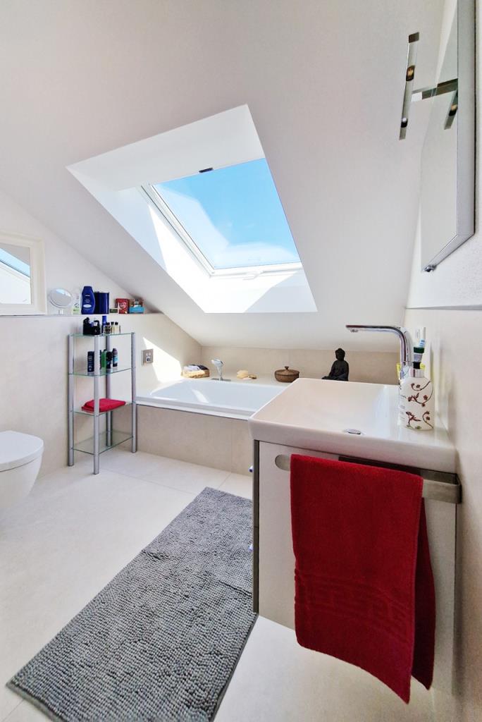 Im ausgebauten Dachstudio befindet sich das zweite Tageslichtbad mit Dusche und Badewanne. Das Studio vermittelt durch die großen Dachflächenfenster und die bodentiefen Fenster auf der Giebelseite ein besonderes Wohngefühl.