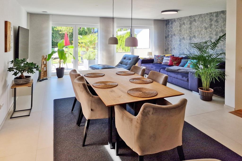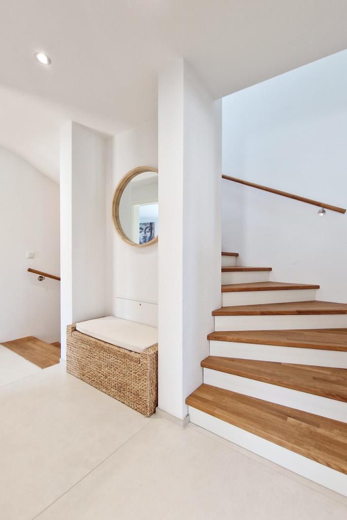 Das Erdgeschoss besteht aus einem ca. 38 m² großen lichtdurchfluteten Wohn- und Essbereich, einer luxuriösen und vollausgestatteten modernen Küche mit Theke sowie einer geräumigen Eingangsdiele mit Abstellkammer und Gäste-WC.