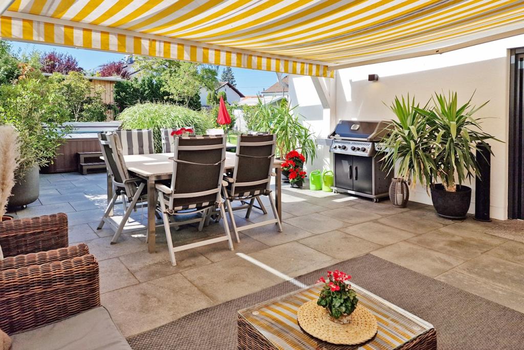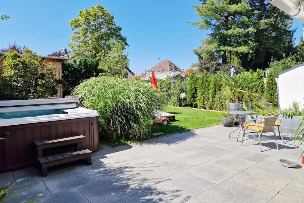 Über die Wohnzimmer- sowie auch über eine seitlich platzierte abschließbare Terrassentür gelangt man zum äußerst großzügigen überdachten Terrassenbereich und dem schön angelegten und uneinsehbaren Garten.