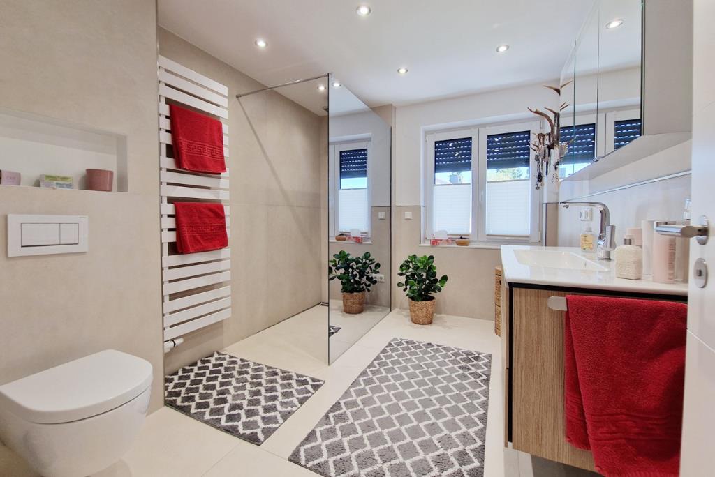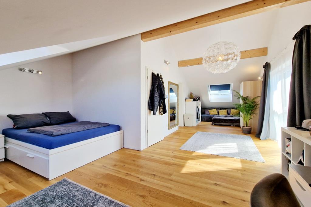 Im Obergeschoss befinden sich zwei großzügige Zimmer (eines davon mit begehbarer Ankleide) sowie ein Tageslichtbadezimmer mit moderner Walk-In Dusche.