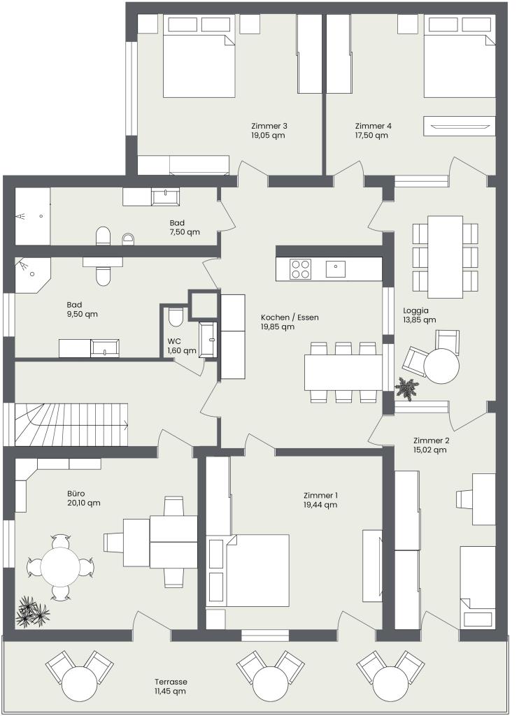 Das 1.OG wurde vollumfänglich modernisiert und kann durch die großzügige und durchdachte Raumaufteilung auf insgesamt 155 m² ideal als Wohnraum aber auch als Bürofläche genutzt werden. Derzeit wird das 1.OG als Wohnraum vermietet.
