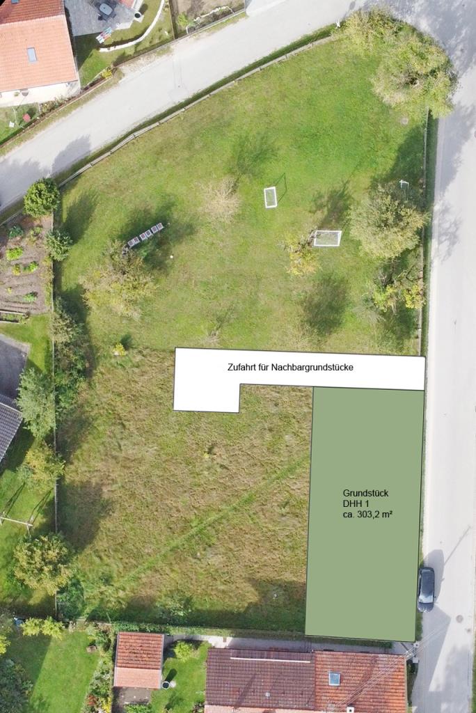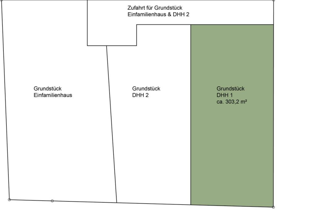 Das gesamte Grundstück wird derzeit real geteilt und die zukünftige Grundstücksgröße für die Doppelhaushälfte 1 (DHH 1) wird ca. 303,2 m² betragen.