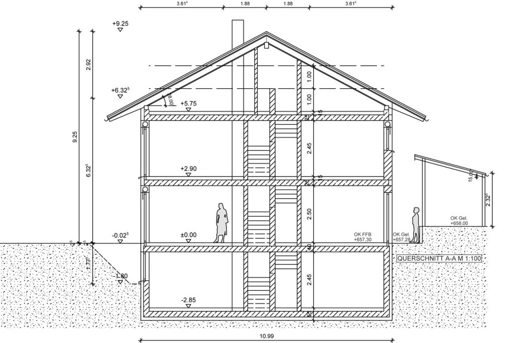 Maße Einfamilienhaus: Länge 10,99 m x Breite 7,63 m x Höhe 6,32 m (Wandhöhe)