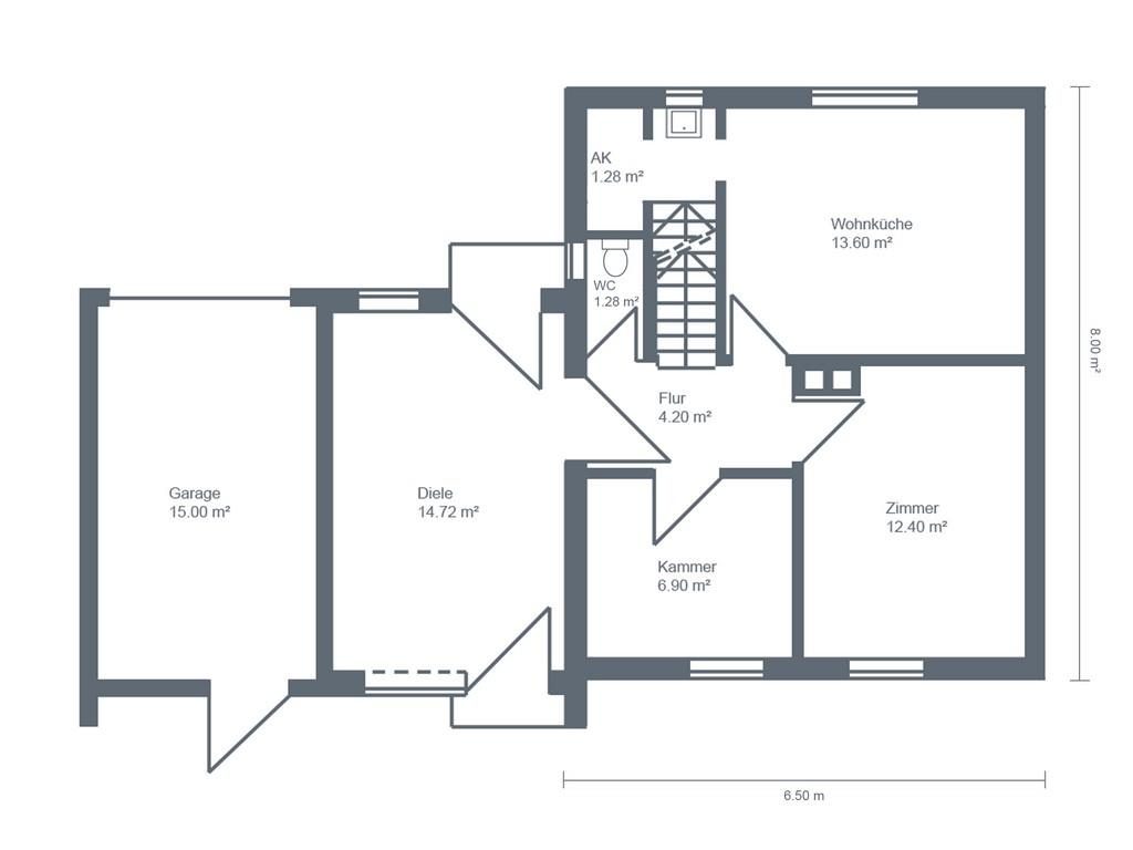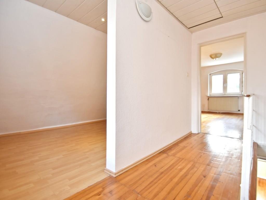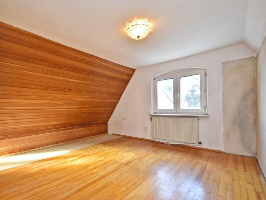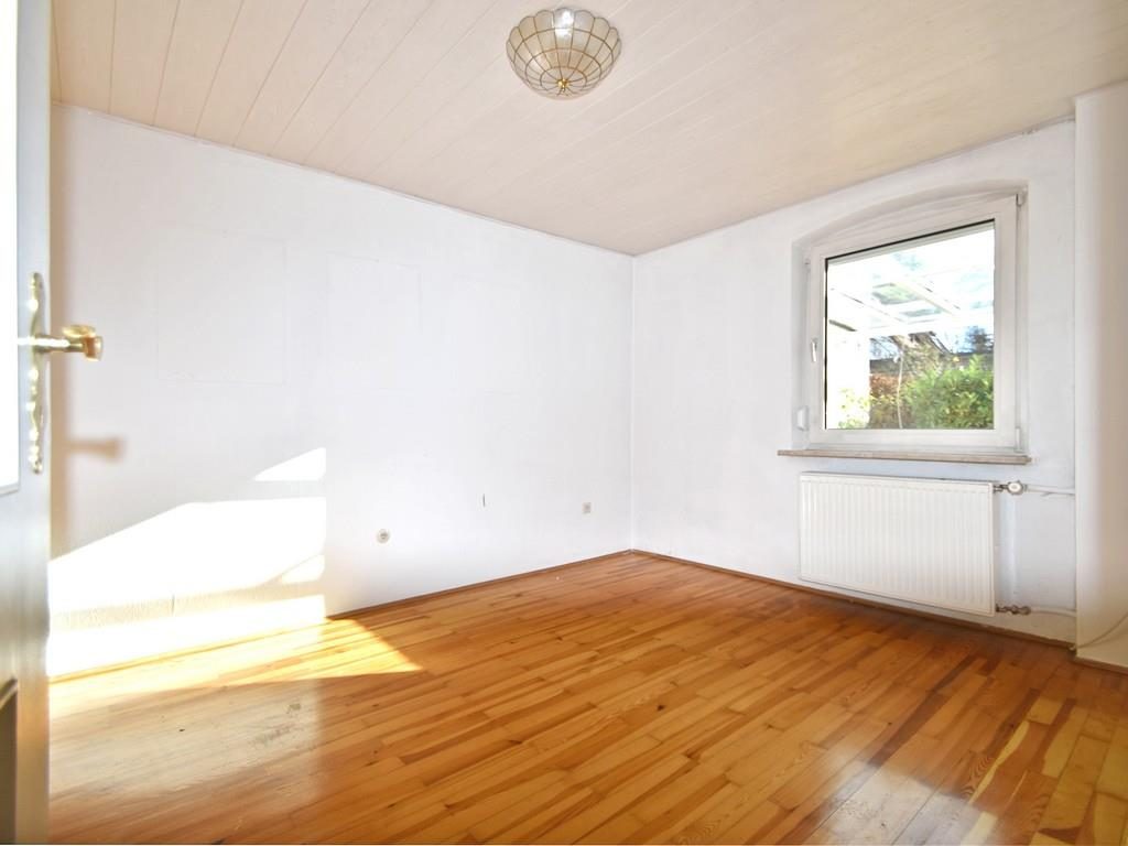 Im Erdgeschoss finden Sie eine gemütliche Wohnküche, ein Wohn- oder Schlafzimmer, einen kleinen Raum, welcher sich zur Benützung als Büro anbietet und ein WC. Zudem wurden 1988 eine Diele und eine Garage mit jeweils ca. 15 m² angebaut. Von der Diele haben Sie auch einen Zugang in den großzügigen, nach Südosten ausgerichteten Garten.