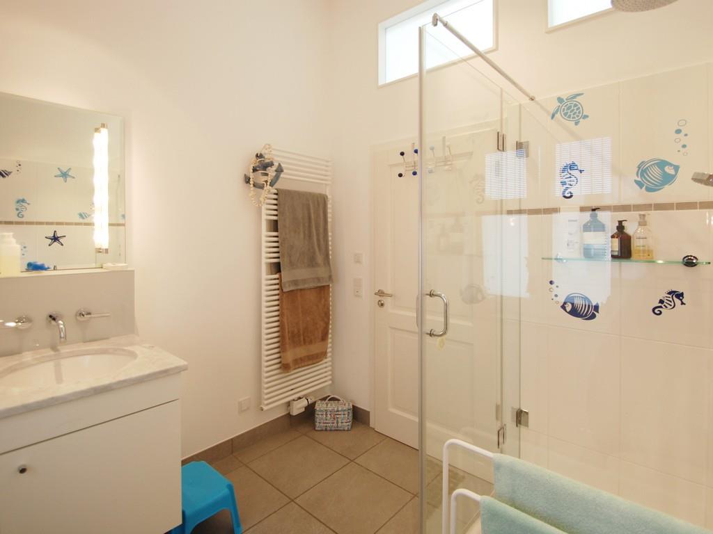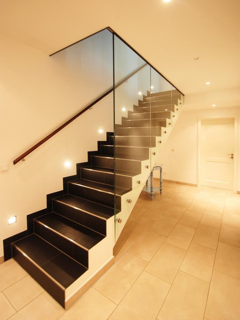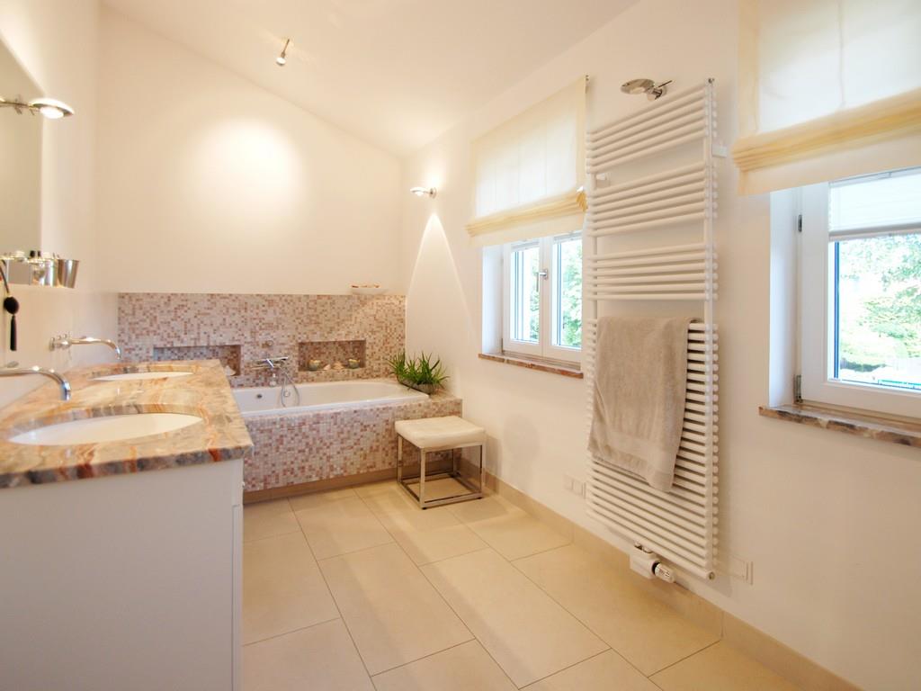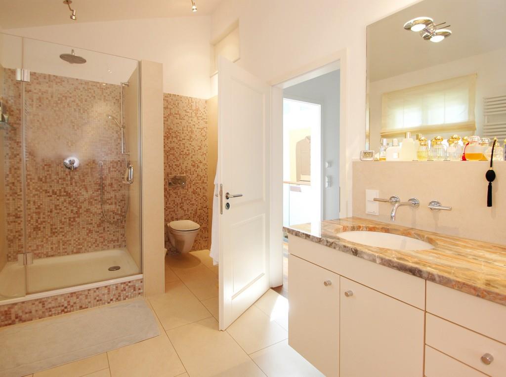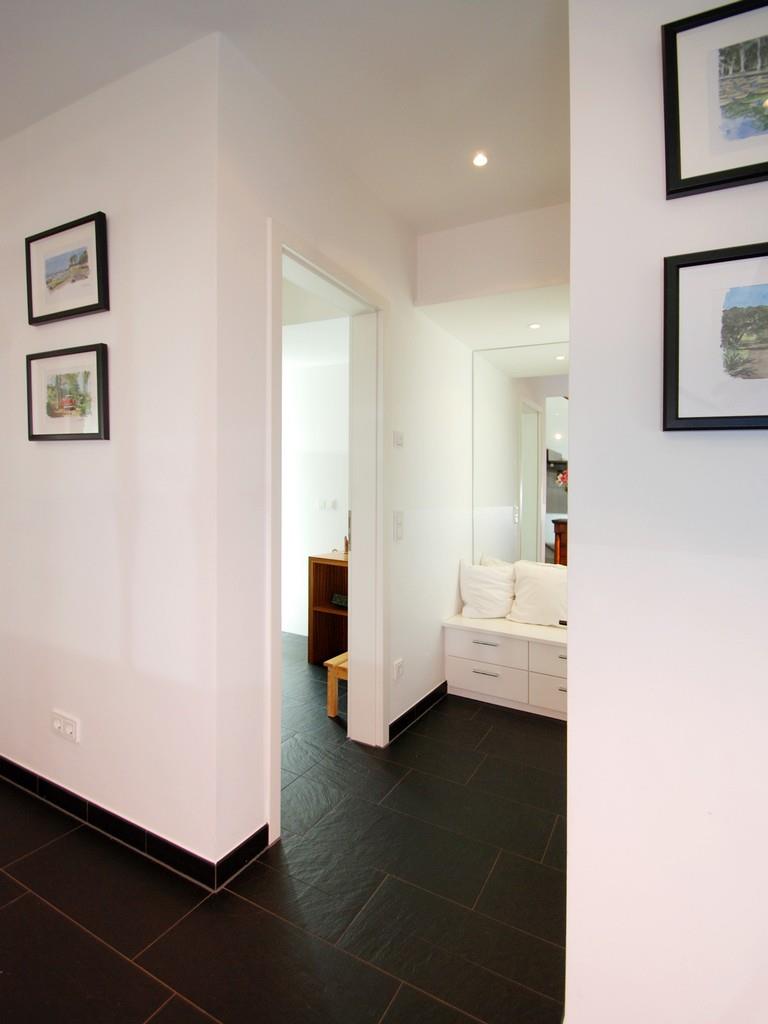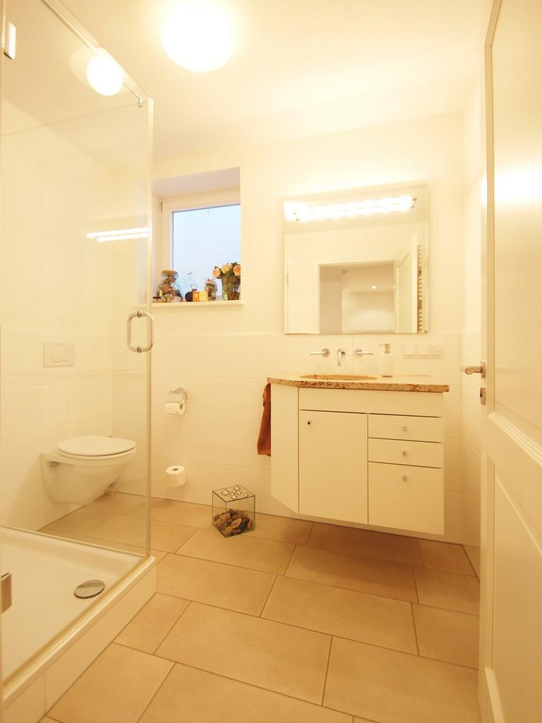 - Feinsteinfliesen im Eingangsbereich, Küche, WC und in den Bädern sowie im Flur im UG