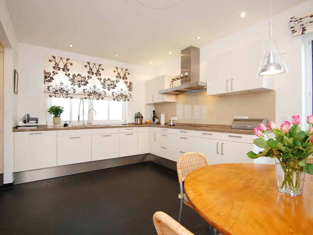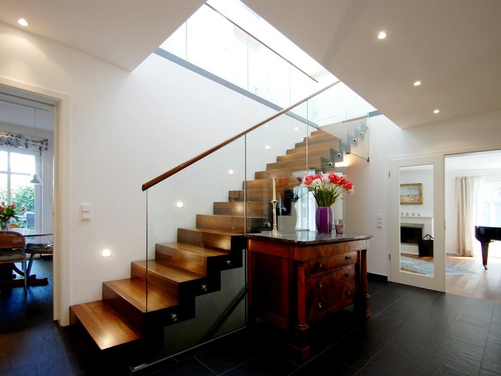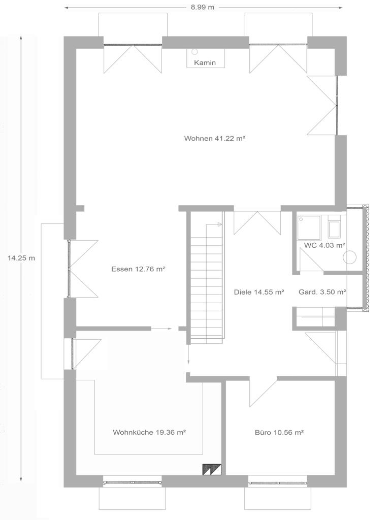Der großzügige Eingangsbereich, welcher mit dem eleganten und offenen Treppenhaus verbunden ist, verfügt über eine Garderobe sowie ein Gäste-WC. Von hier aus sind alle Zimmer des Erdgeschosses erreichbar. Zur Linken befindet sich ein kleines Zimmer, welches optimal als Büro genutzt werden kann. Zur Rechten gelangen Sie in das große lichtdurchflutete Wohnzimmer mit einem großen und offenen Kamin. Der Wohnbereich geht fließend über in den Essbereich mit Zugang zu der großzügigen Wohnküche, welche über viel Stauraum und sämtliche Elektrogeräte verfügt.