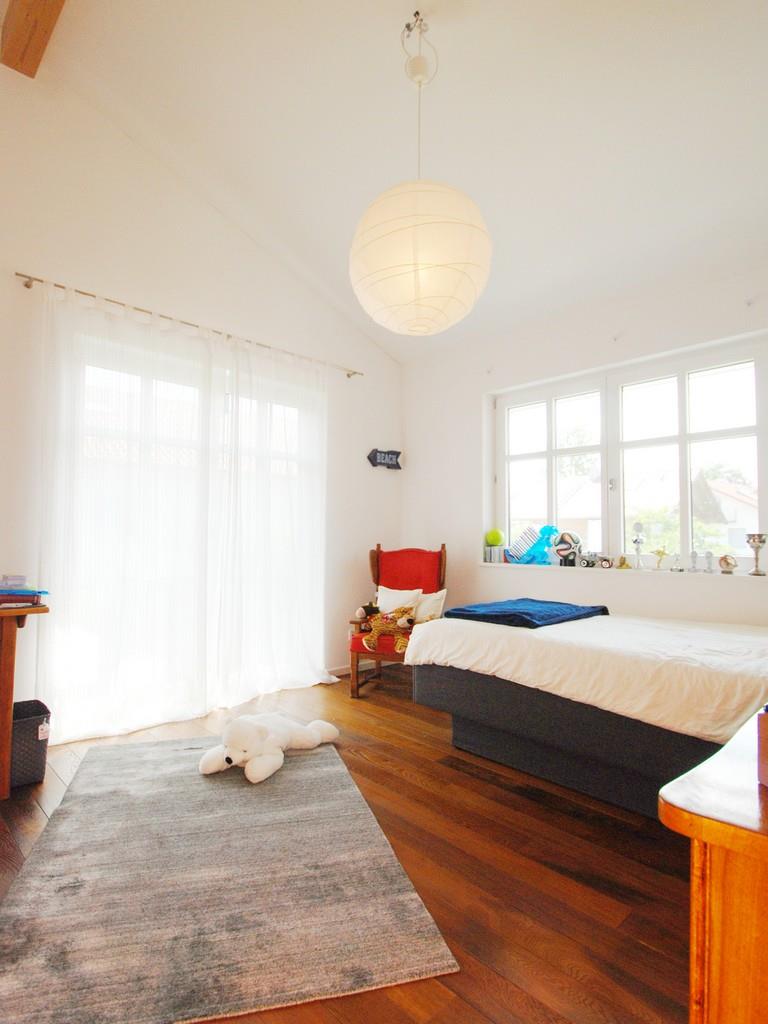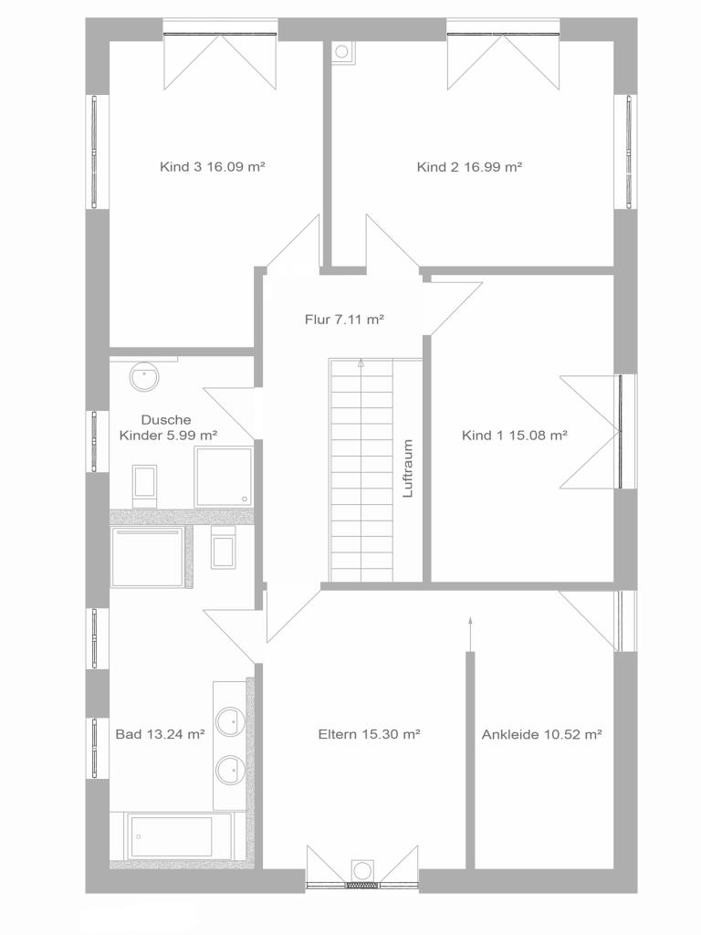 Das Obergeschoss besteht aus drei nahezu gleichgroßen Kinderzimmern mit eigenem Duschbad sowie dem Elternschlafzimmer mit direktem Zugang zu dem geräumigen Badezimmer und einem Ankleideraum.