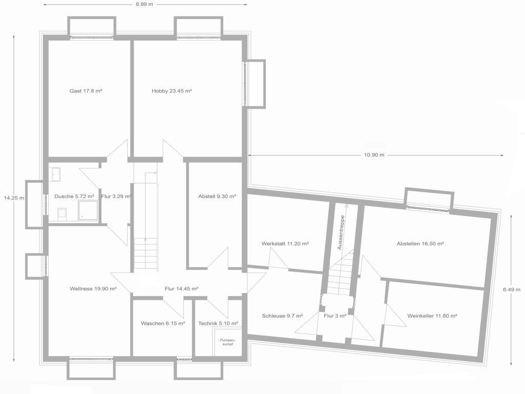 Über eine Schleuse gelangen Sie in den Kellerbereich unter der Doppelgarage, welcher aus einer Werkstatt, einem weiteren großen Abstellraum sowie einem Weinkeller besteht.