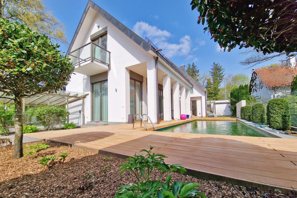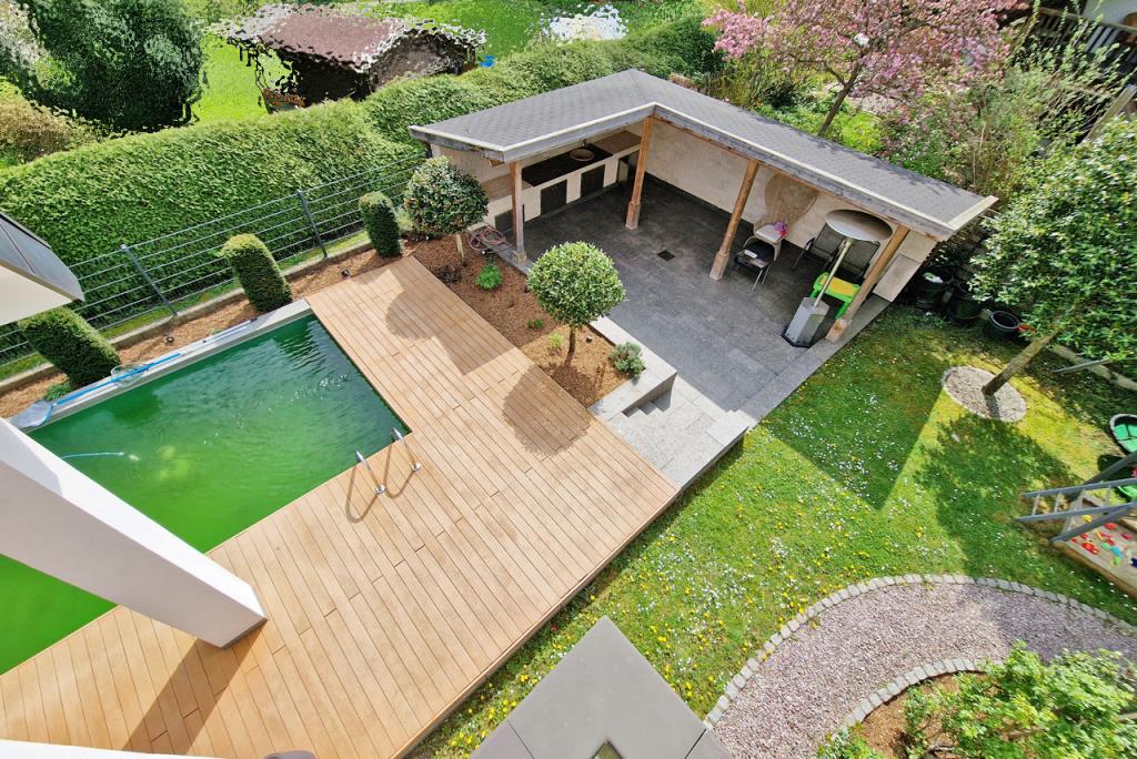 - überdurchschnittlich große Südterrasse mit Außenpool und Koiteich