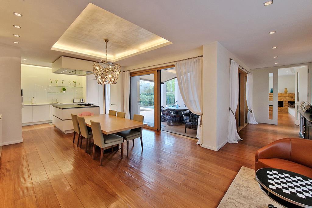 Neben der Einliegerwohnung befindet sich im Erdgeschoss der Wohnbereich sowie der offen zum Esszimmer konzipierte Kochbereich. Die Einbauküche von Dross & Schaffer lässt keinerlei Wünsche offen und befriedigt sogar gekonnte Köche mit Gaggenau-Geräten wie Kaffeevollautomat, Dampfgarer mit Tellerwärmeschubladen und eine Kochinsel mit integrierter Teppanyaki-Platte.