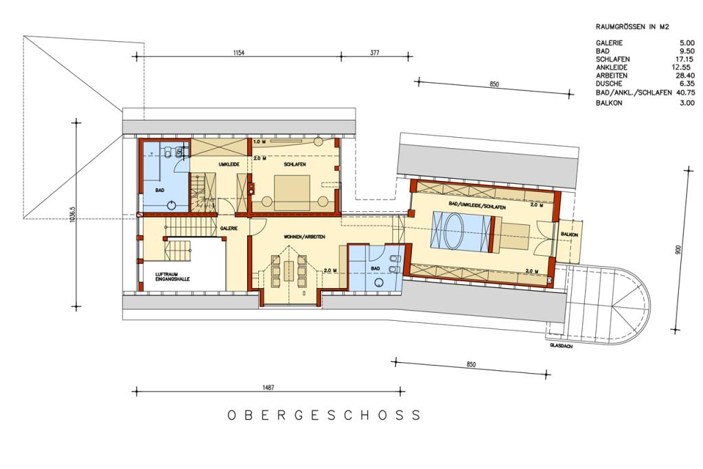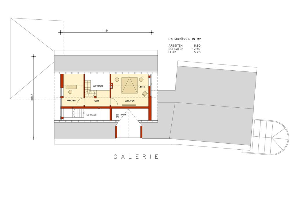 - Schlaftrakt im Obergeschoss mit Badezimmer, Ankleide und Galeriebebauung mit zwei weiteren DG-Schlafzimmern