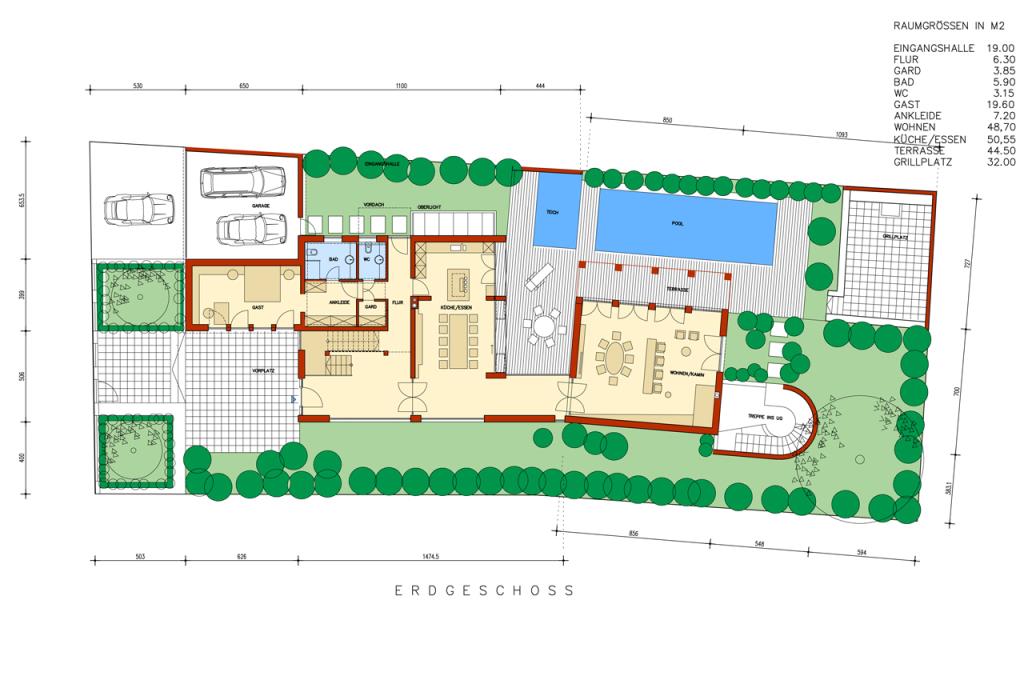 Großzügige Proportionen und ein Raumangebot von über ca. 640 m² prägen die Immobilie. Der Grundriss ist bis ins kleinste Detail durchdacht und ausgesprochen familienfreundlich.