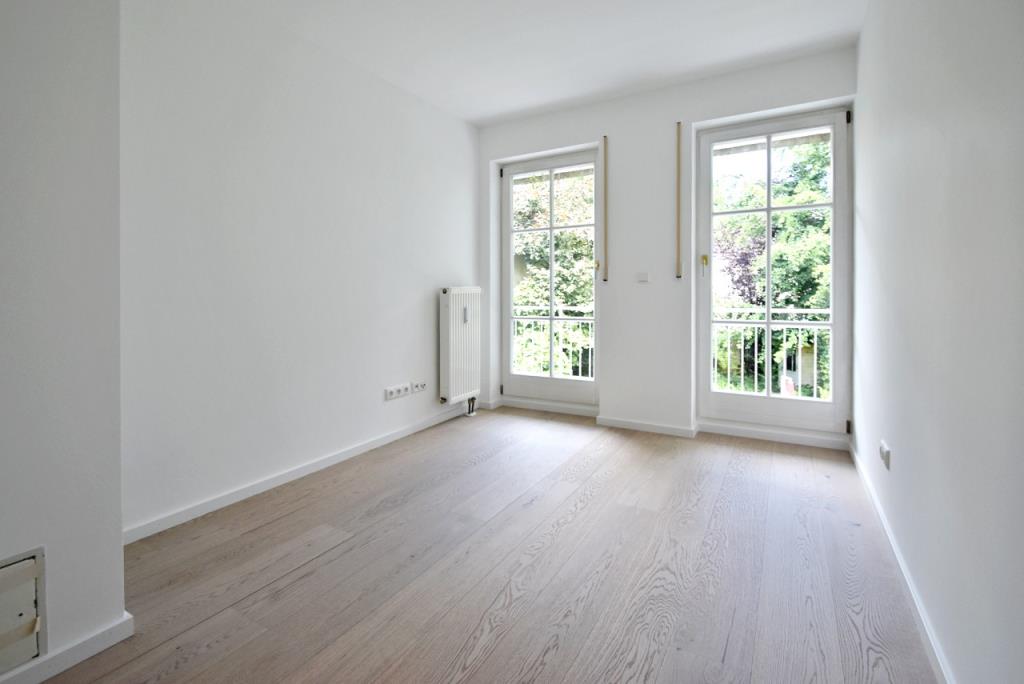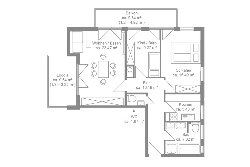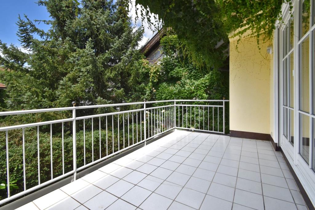Zur Wohnung gehört außerdem ein Westbalkon, welcher sich über die gesamte Rückseite des Gebäudes erstreckt und einen Blick ins Grüne bietet. Dieser Balkon ist von allen Wohnräumen der Wohnung zugänglich. An den Wohnbereich schließt sich auch die große Süd-Loggia mit ca. 10 m² an. Auch von dieser haben Sie einen Blick ins Grüne und auf das historische Bauernhaus in der Nachbarschaft.