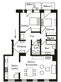 Ein Vorraum mit reichlich Platz für eine Garderobe bildet den Empfang und Eingang der Wohnung. Sie geht in einen großzügigen Wohn-/Essbereich mit angrenzender Wohnküche über. Die Einbauküche verfügt über vollen Komfort, mit allen elektrischen Geräten und jeglichem Essgeschirr.